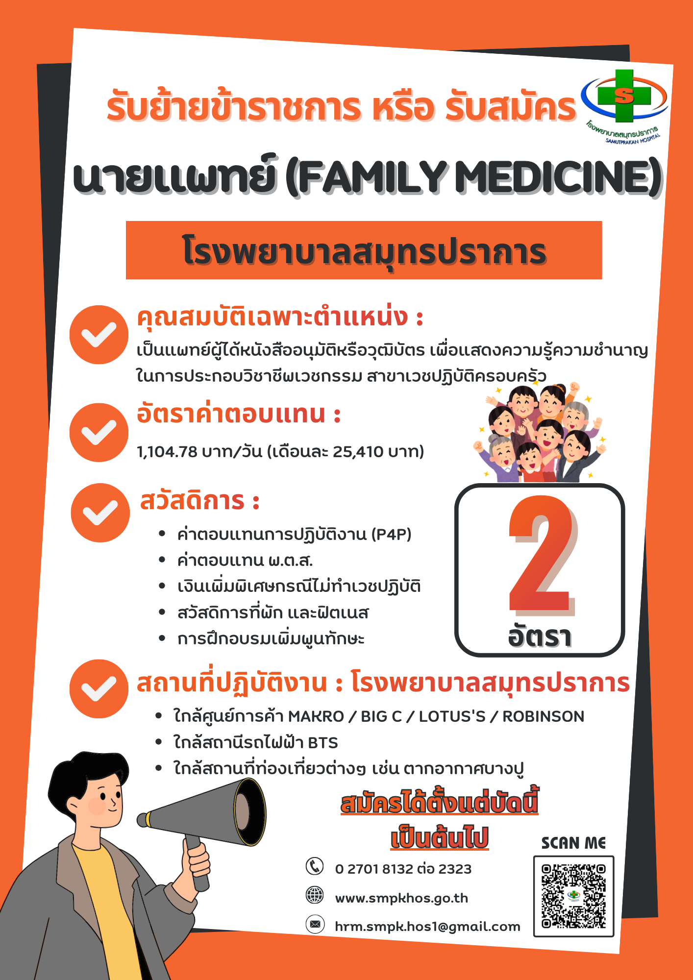 ประกาศรับย้ายข้าราชการ หรือรับสมัครนายแพทย์ จำนวน 2 อัตรา