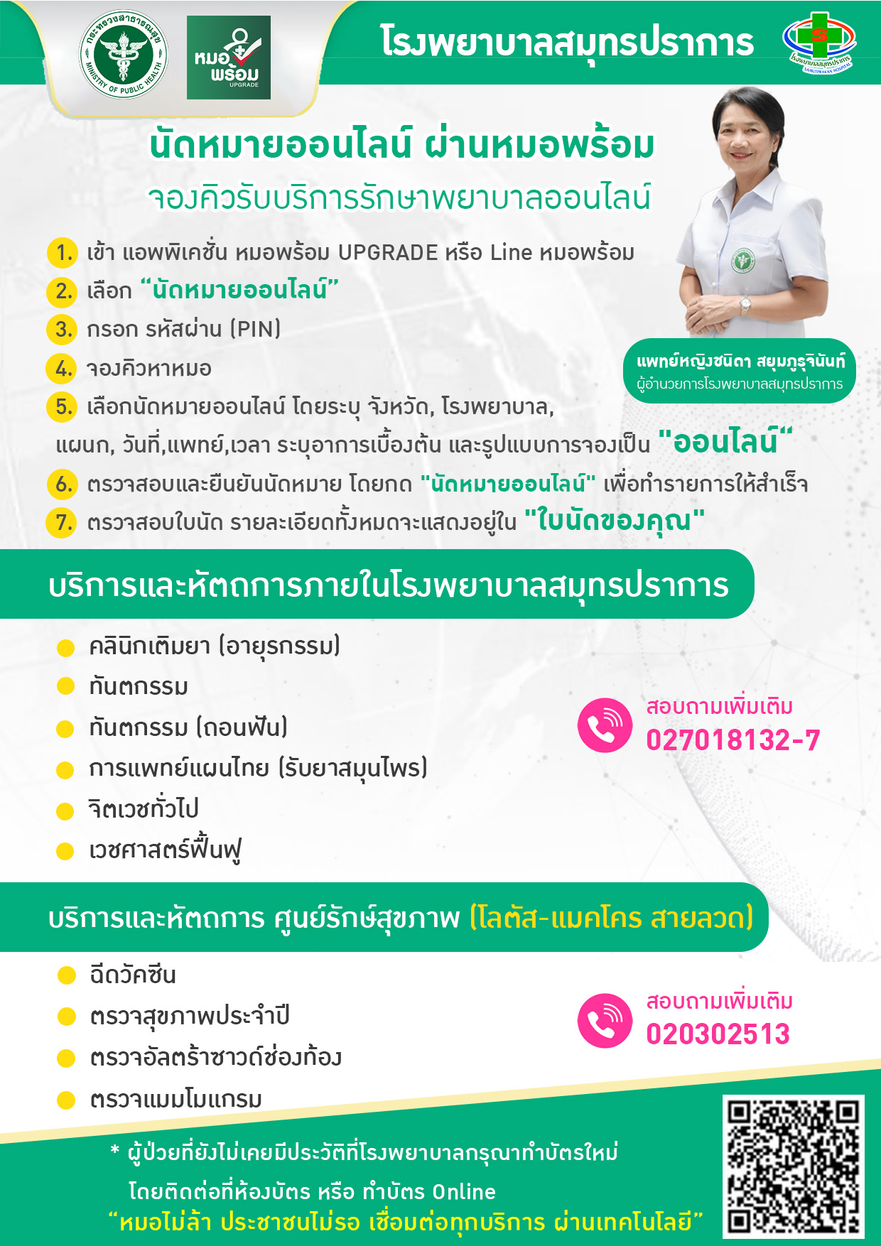 เปิดให้บริการตรวจสุขภาพประจำปี และฉีดวัคซีน (แบบชำระเอง) ณ ห้างแม็คโคร โลตัส มอลล์ สมุทรปราการ (ถนนสายลวด) วันจันทร์-ศุกร์ (หยุดวันเสาร์-อาทิตย์ และวันหยุดนักขัตฤกษ์) เวลา 8.00-16.00น. ติดต่อ ไลน์ @320traff ศูนย์รักษ์สุขภาพ สป ** ค่าบริการเป็นแบบชำระเงินเอง ไม่สามารถใช้ร่วมกับสิทธิ์การรักษาอื่นๆ ทุกกรณี **